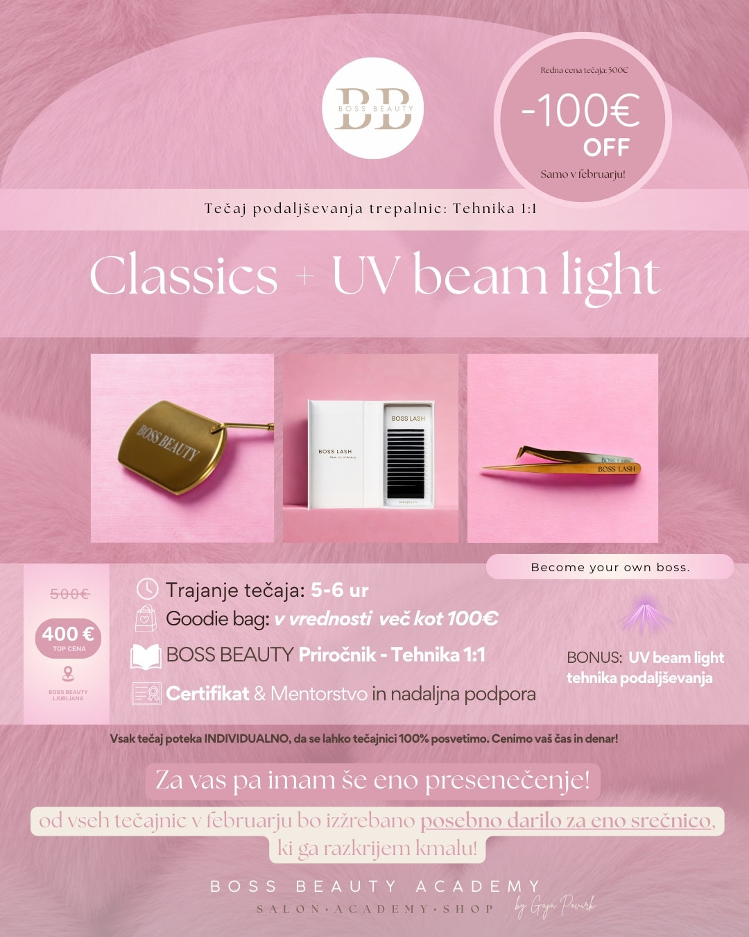 Tečaj bo v februarju znižan na 400 €, seveda individualen, poleg tega pa vsaka udeleženka prejme tudi goodie bag z izdelki Boss Lash v vrednosti več kot 100 €, nadaljno mentorstvo in podporo in naš Boss Beauty priročnik.